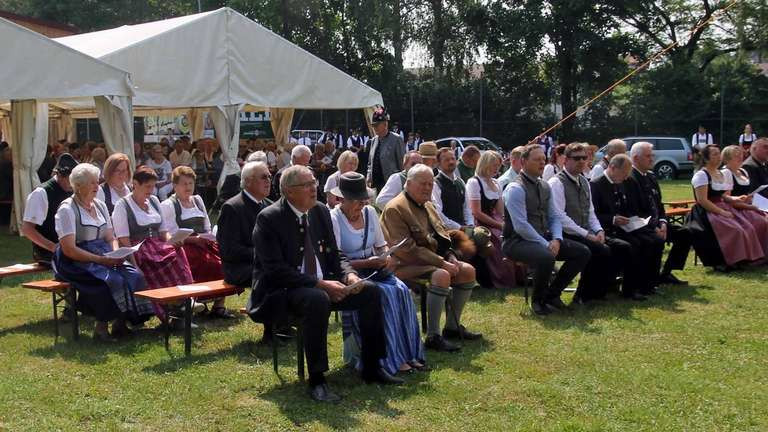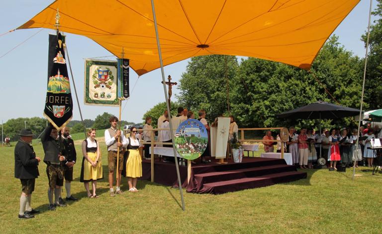 Auf dem Freialtar am Fußballplatz in Oberdorfen feierten die Schützen den Festgottesdienst anlässlich des 100. Jubiläums des Schützengaus Dorfen, bei dem Pater Stephan die restaurierte Gaufahne segnete © Peter Stadler