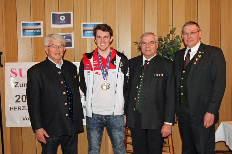Bezirksschützenmeister Alfred Reiner, Ehrenbezirksschützenmeister Josef Niedermeier, Bezirkstrainer Simon Deml und Gauschützenmeister Georg Schatz zeigten sich ebenfalls beeindruckt über die großartigen Erfolge von Maximilian Dallinger und gratulierten dem Goldmedaillengewinner für sein starkes Auftreten bei den Europameisterschaften im ungarischen Györ. Georg Schatz zeichnete Maximilian Dallinger bei dieser Gelegenheit mit dem Gauehrenzeichen des Schützengaue Dorfen aus.