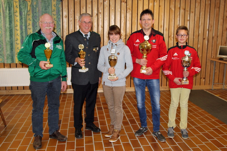 Einzelmeister bei den Auflageschützen wurde Georg Tafelmeier (Grüntegernbach) mit 104 Ringen. Die Meisterscheibe mit der Luftpistole sicherten sich in den jeweiligen Klassen, Elias Tafelmeier (Gmain, 78,4R.), Katharina Pichlmeier (Hofgiebing, 98,3 R.), Benno Waxenberger (Lengdorf, 96,8 R.), Simon Radeck (Geislbach, 100,5 R.) und Josef Obermaier (Lengdorf, 99,1 R.). Mit dem Luftgewehr trafen in der Schützenklasse insgesamt 21 Schützen mehr als 100 Ringe, Sieger wurde mit 105,3 Ringen Maxi Dallinger (Lengdorf). Weitere Klassensieger wurden Nicole Wendlinger (Kienraching, 99,3 R.), Sophie Hei߸ (Lengdorf, 104,3 R.), Nicole Ertl (Niederstraubing, 103,9 R.), Benno Waxenberger (Lengdorf, 103,6 R.) und Josef Mutlitz (Hubenstein, 101,8 R.). Den besten Teiler mit dem Luftgewehr schoss Alexander Schatz (Inning) mit einem glatten 1,0 - Teiler, mit der Luftpistole war Simon Radeck mit einem 8,5-Teiler erfolgreich.