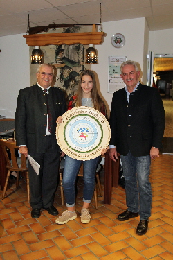 Regina Grasser hat beim diesjährigen Dorfener Gauschießen die Landratsscheibe gewonnen. Jeder Teilnehmer der Schüler-, Jugend- und Junioren-B-Klasse darf für diese Ehrengabe des Landkreises Erding einen Extraschuss abgeben. Mit einem 44-Teiler hatte Regina Grasser vom Schützenverein Eichenlaub Wambach den schönsten Zehner darauf geschossen. Geschlagen geben mussten sich Franziska Kiebelspeck (Moosen) mit einem 61-Teiler und Tobias Otter (Hofgiebing) mit einem 73-Teiler. Für Landrat Martin Bayerstorfer, der bei der Preisverteilung nicht anwesend war, gratulierten Gauschützenmeister Georg Schatz (l.) und Dorfens Sportreferent und 4. Gauschützenmeister Anton Stimmer (r.).